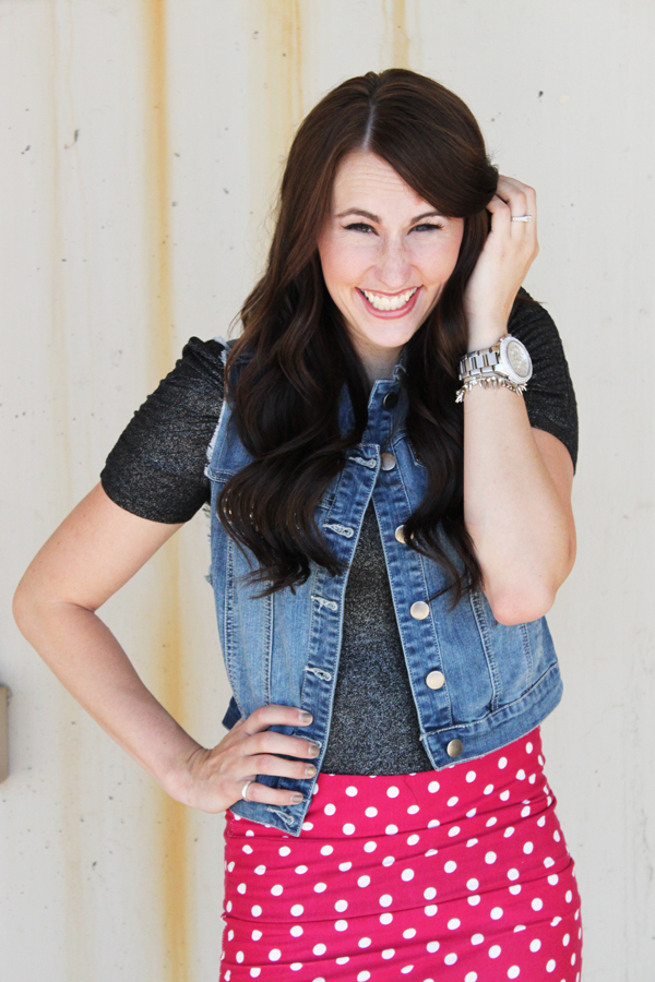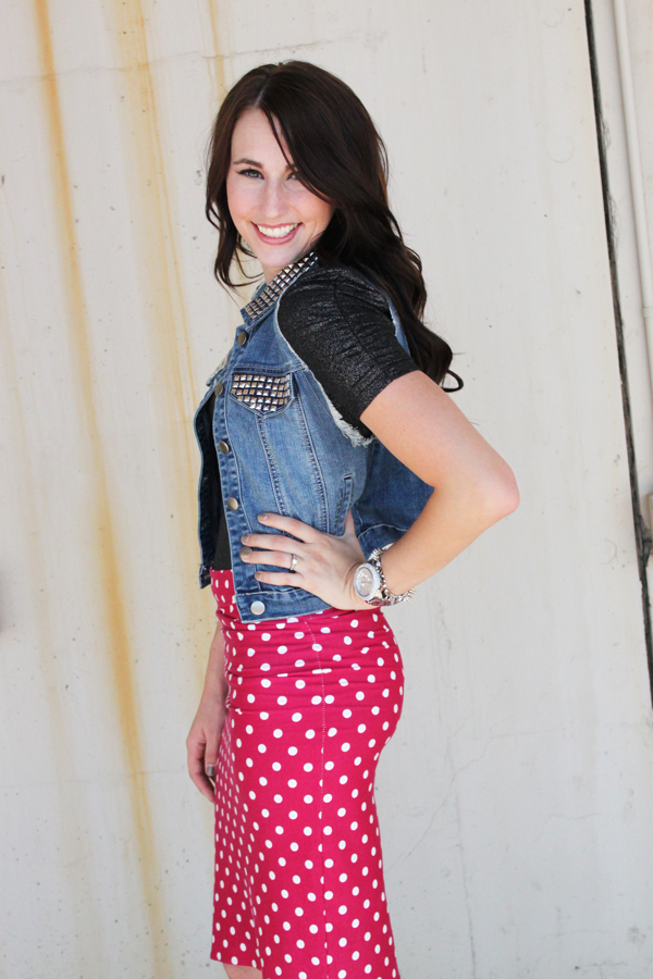 Okay, now to the outfit! Do you girls love to change up the look of a typical pencil skirt? You know me and my love for pencil skirts. I wear them so often that I am always looking for new ways to spice them. This was a fun rocker/glam look that I did to this fun polka dot skirt! I wore this fun metallic black tee from Forever 21 to give it a more glam look, and this fun studded vest from Sugar Love Boutique to give it a little bit of a rocker edge. It is such a fun twist on the regular pencil skirt. What’s your favorite way to change the look of your pencil skirts?