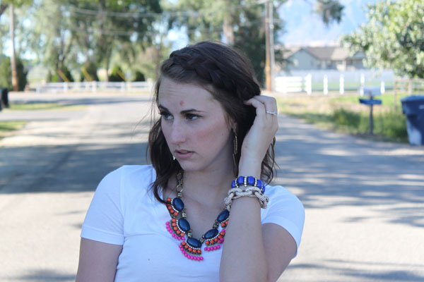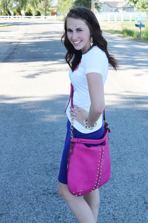 I absolutely love bright colors in the summer. I love to bring color into my outfits in different ways. For this one I did the color pop with the handbag and the statement necklace. This purse is perfect for summer. I love that it has the cross body (is that even a term?!) strap so its not dragging down my shoulders. I carry SO much stuff in my purse, you never know when your going to need something right?