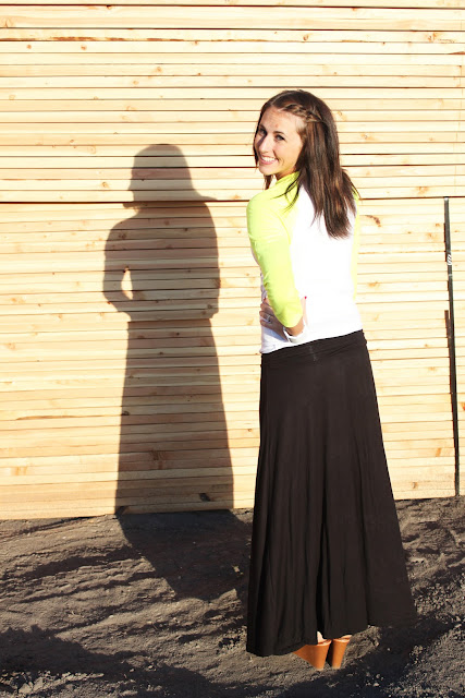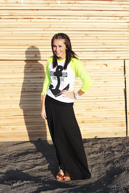 I love maxi skirts for this time of year! They are so comfy but a change from jeans. I also am loving this baseball tee from The Printed Palette! I love the neon sleeves but the cute graphic on the front! I thought it was a fun thing to pair with a maxi skirt for a mix. I hope you all had a good Monday!