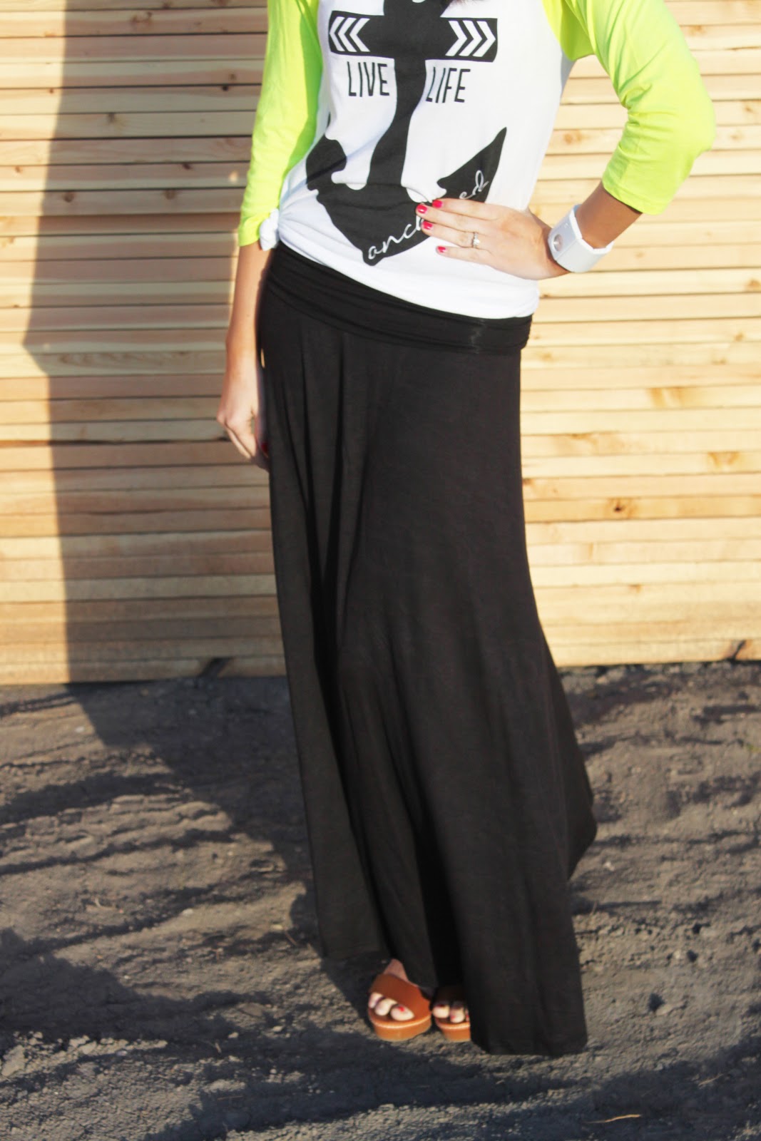 I love maxi skirts for this time of year! They are so comfy but a change from jeans. I also am loving this baseball tee from The Printed Palette! I love the neon sleeves but the cute graphic on the front! I thought it was a fun thing to pair with a maxi skirt for a mix. I hope you all had a good Monday!