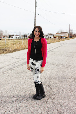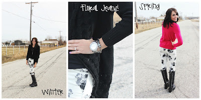 I am loving these black and white floral jeans! I love that you can pair them with so many different things to give different looks. I am going to show you 2 looks today. One is to finish out this winter weather, and the other one is for spring! Patterns are such a fun trend right now! Don’t be afraid of them! If you are a little hesitant try them in a scarf, if your ready to go for it then go for a shirt or jeans! Just be brave a time or two then I promise you will love them!
