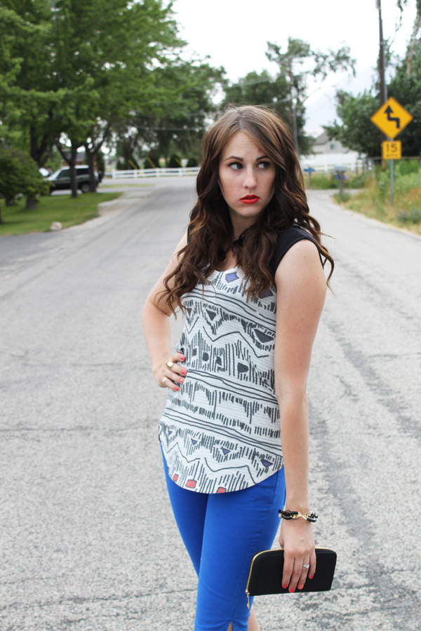 Oh tribal print… I just love it. And I am totally okay with it, I hope you guys aren’t sick of it yet! I love this black and white tank with a pop of blue and red in it. The tank is super slimming too which is always nice!