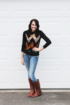 As you can probably tell I am loving prints right now! I love this chevron sweater! Its a light weight sweater so its perfect for right now! One thing I struggle with is mixing black and brown. I see a lot of people do it and its so cute on them but I struggle to do it for myself. I am loving it with this sweater though! I also love the chunkiness of the necklace and how it adds another texture.