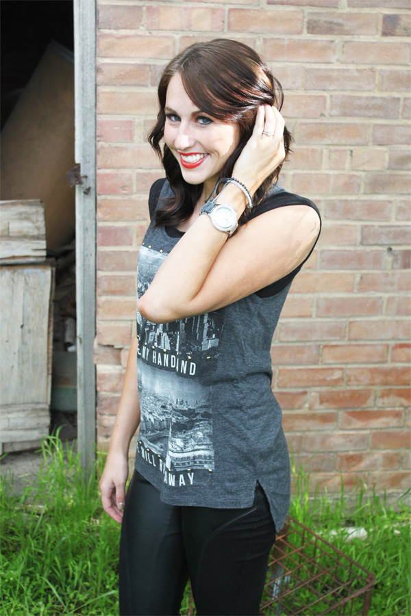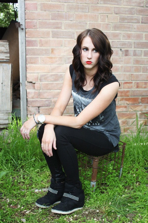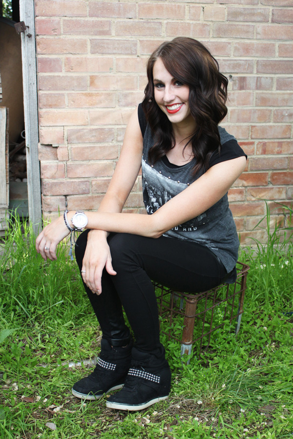 Summer pieces have been so hard for me to find this year… and I was so glad to find this cute tank. You can really wear this anytime of year. You can wear it under a blazer, cardigan, tee-shirt, really anything! It is longer in the back which I love. I also love the studded details on it. I paired it with some liquid leggings and my wedged sneakers to give it more of a rocker feel. If you would like to order one (which you won’t be disappointed in it if you do!), Dolled Up Fashions has FREE SHIPPING right now! Even more of a reason you need to grab yourself one of these darling tanks!