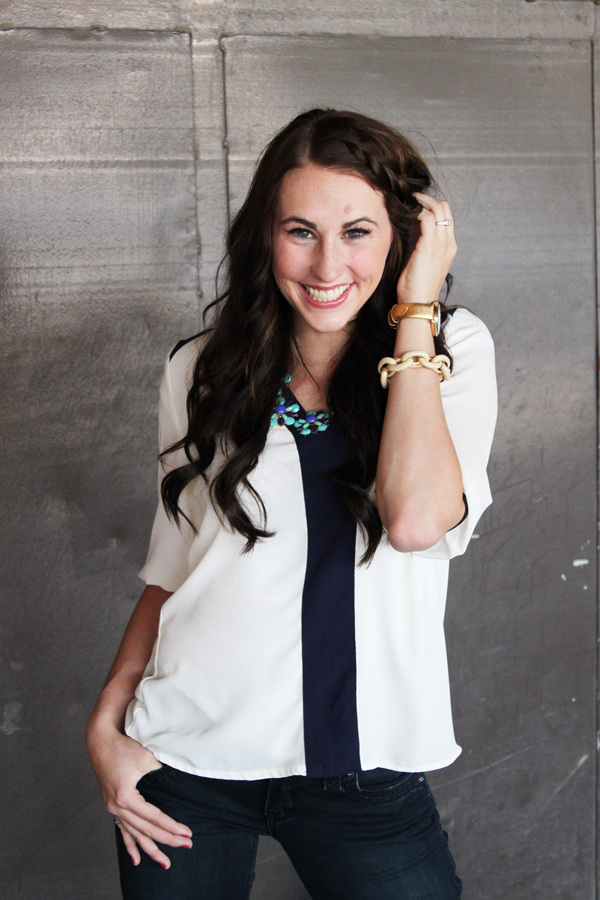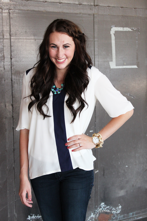 Okay, so I know my hair is a little out of control in these pictures… I couldn’t tame it this day so I just embraced it! I have officially pulled out my boots and am ready for fall. So you will be seeing a lot of them coming up! I am loving this top from Ms Fancy Pantsy! It is the perfect top for the transition to fall. I love the navy details on it. It also would be darling tucked into a bright colored pencil skirt!