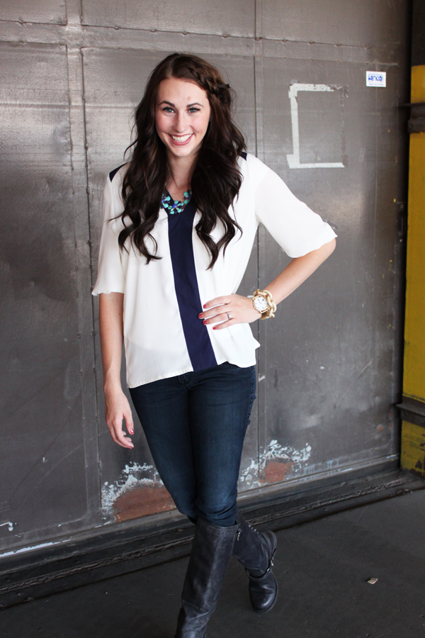 Okay, so I know my hair is a little out of control in these pictures… I couldn’t tame it this day so I just embraced it! I have officially pulled out my boots and am ready for fall. So you will be seeing a lot of them coming up! I am loving this top from Ms Fancy Pantsy! It is the perfect top for the transition to fall. I love the navy details on it. It also would be darling tucked into a bright colored pencil skirt!