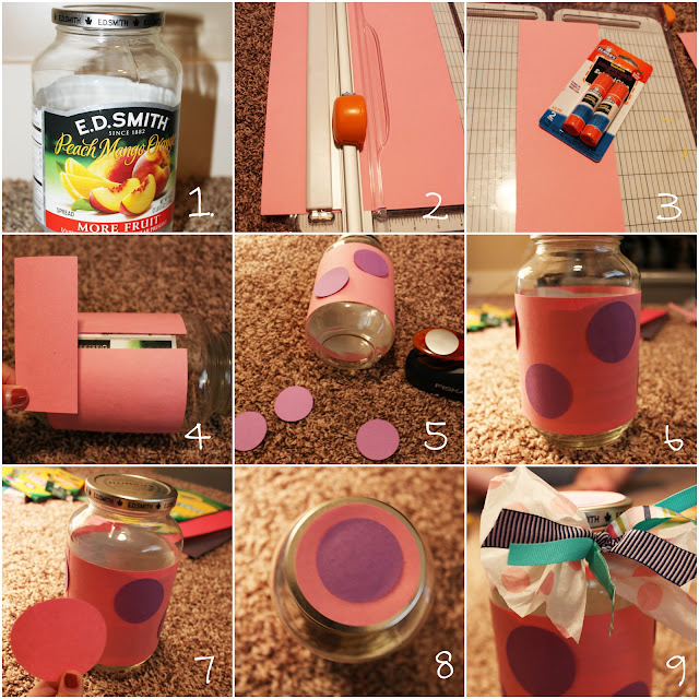 - Using a glue stick, glue the paper around the jar.
