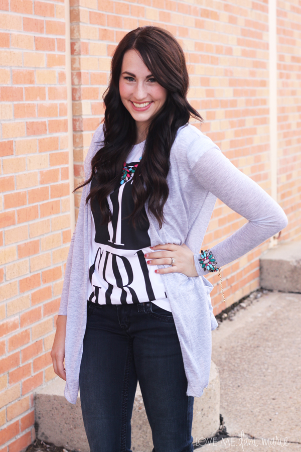 I love this outfit. It is definitely one of my favorites! These amazing light weight cardigans will be on Jane today for an amazing deal!! They are so perfect for this time of year. Oh and did I mention how soft they are!? Umm… Pretty heavenly! You will want to go snag one quick, because they will sell out fast! I paired it with this fun IT GIRL baggy tee and some bright accessories! It is the perfect look for running errands. It is comfy but still trendy and cute. My motto in getting dressed!