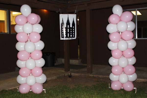 (You blow up balloons and tie 2 ends together, then twist one pair of 2 to another pair. Then wiggle them onto the PVC pipe. I googled balloon pillars and found a YouTube Video on it. It was so so easy and quick to put together)