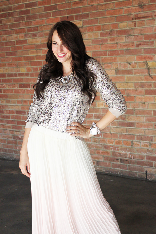 I’m seriously loving this outfit. The pleated maxi skirt is great and the sequined top is so fun!