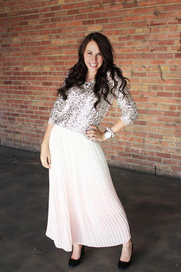 I’m seriously loving this outfit. The pleated maxi skirt is great and the sequined top is so fun!