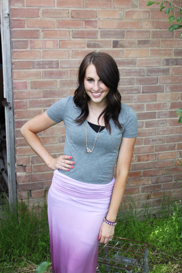 Purple Ombre Skirt: c/o: Dolled Up Fashions Tee Shirt: Target Earrings: c/o: Evie J Boutique Bracelet: c/o: Evie J Boutique Necklace: c/o: Ruby Pier
