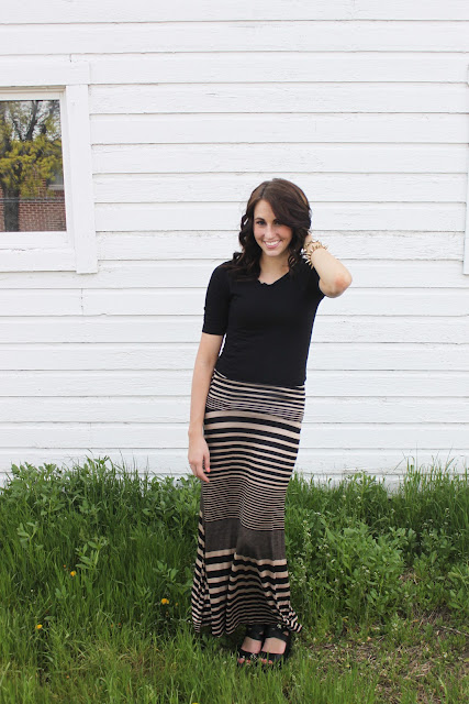 I love a casual outfit to just throw on to run errands or go out to lunch! Patterned maxi skirts are just that for me! You can just put on a basic tee and necklace (which I forgot to put on!) and you have an easy outfit!
