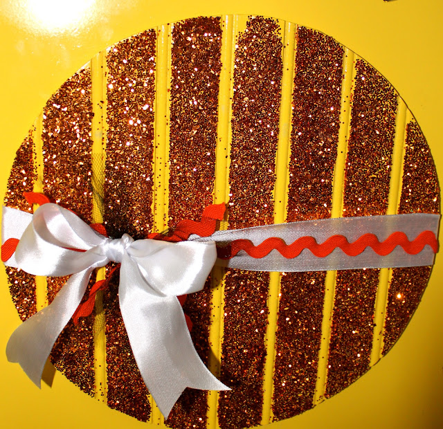 I found a picture of a cute sun online, and did my own designing to it and came up with this! Zach cut the bottom portion (the pointy things) out of plywood and the center out of bead board. We then painted it bright yellow and modge podged the center of the bead board and glittered it! I wanted it a little more girly so I tied white ribbon, orange ric rack, and black tulle around it to make a cute bow! I LOVE it hanging on my door!! I also made some small ones for easels that turned out darling for people who don’t hang things on their door 🙂