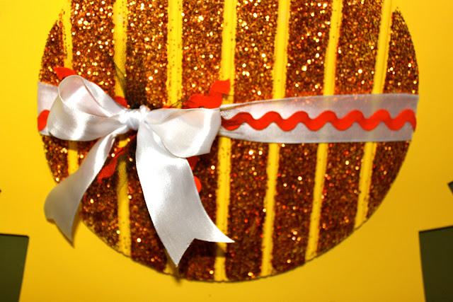 I found a picture of a cute sun online, and did my own designing to it and came up with this! Zach cut the bottom portion (the pointy things) out of plywood and the center out of bead board. We then painted it bright yellow and modge podged the center of the bead board and glittered it! I wanted it a little more girly so I tied white ribbon, orange ric rack, and black tulle around it to make a cute bow! I LOVE it hanging on my door!! I also made some small ones for easels that turned out darling for people who don’t hang things on their door 🙂