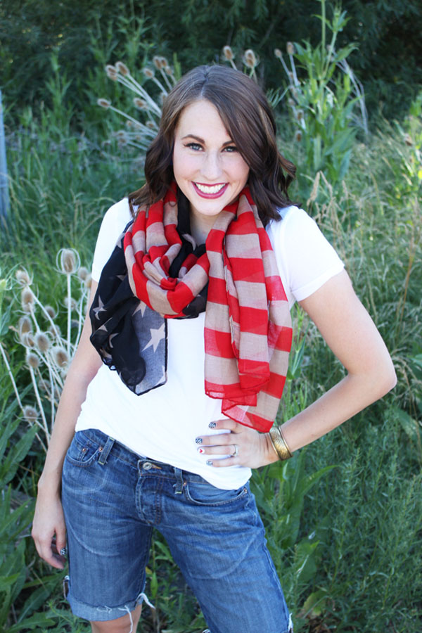 1. Wear a light weight tee shirt with a cute American flag scarf. These scarves are everywhere this year and I am loving them. They show your American pride but aren’t one of those USA shirts you can find at Old Navy or places like that. You can pair it with boyfriend shorts which are nice and loose for the heat.